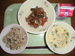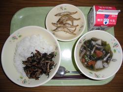 27日(火) こんぶごはん 牛乳 炒り鶏 かきたま汁 ★日本のこんぶのほとんどは、北海道でとれます。 今日はこんぶを細く切り、甘辛く煮てごはんと一緒に 炊き込みました。 |