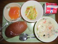 23日(金) 黒パン 牛乳 ホワイトシチュー 野菜ソテー にんじんゼリー ★にんじんゼリーは、にんじんに砂糖、レモン果汁を加えて 作りました。フルーツっぽさを感じる味でした。 |
