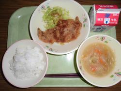 29日(木) ごはん 牛乳 とんカツ ボイルドキャベツ みそ汁 ★今日のとんカツは、調理員さんが一枚ずつ衣をつけて、 油で揚げて作りました。感謝の気持ちをもち、 心をこめてあいさつをしていただきました。 |