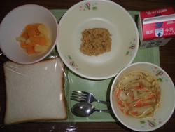 13日(火) 食パン 牛乳 ツナペースト ヌードルスープ ミックスフルーツ ★ヌードルスープには「フェットチーネ」を使いました。 フェットチーネは平たく細長い形をしていることから、 イタリア語で「小さなリボン」という意味の名前が付けられています。 |