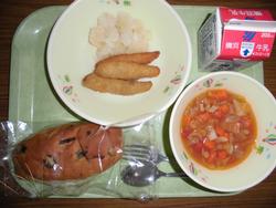 24日(火) ぶどうパン 牛乳 いりこフライ こふきいも ミネストローネ ★いりこフライは新献立です。 少し苦味はありますが、丸ごと食べられる小魚で カルシウムをたくさんとることができました。 |