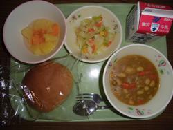 26日(木) 丸パン 牛乳 カレービーンズシチュー 野菜ソテー ミックスフルーツ ★給食は体の大きさや成長の時期にあわせて必要な栄養の量が変わります。 その成長にあわせて、低・中・高学年と量をかえています。 |