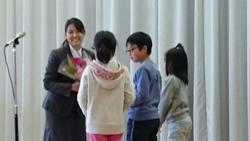 全校児童を代表して5年生児童からは楽しかった思い出や感謝の気持ちを、英語と日本語の両方の言葉で、また、2年生児童からは花束を、心を込めてリーゼル先生に贈りました。