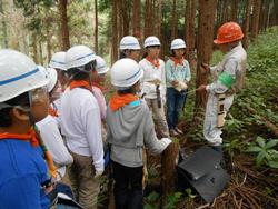 3日目は、退村式をして足柄ふれあいの村を後にし、グループに分かれて林業体験で間伐を経験しました。子どもたちは、実際に体験することで、働く人の大変さや森林の大切さに気付くことができました。到着式では、疲れている様子でしたが、最後まで立派な態度で臨む姿が見られました。