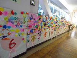 ペア学年が協力して、「6年生おめでとう」の素敵な花束飾りを日下っ子全員でお祝いの気持ちをこめて作りました。卒業式の日に卒業生が目にすることができるように、職員室前に掲示されています。