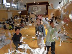 折り紙を折って切るチョッキンパをし、その紙を型にして、スパッタリングをしました。型の置き方や色を重ねるといった工夫がみられました。ブラシで網をこすることが難しかったのですが、型を外したときにできた模様に歓声を上げていました。
