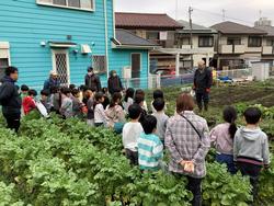1年生は、菜園で大根を掘りました。土の中から大根を両手でゆっくりと引っ張りました。自分の顔よりも大きな大根を、1人1本おうちに持って帰りました。大根の葉っぱはふさふさで、袋に入りきらないほどでした。給食にもだしていただき、みんなで美味しくいただきました。