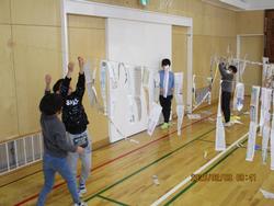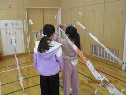 2年生は体育館で、造形遊びをしました。新聞紙を細く破き、たくさんつなげて遊びました。つなぎ方を工夫して、カーテンや橋、輪飾りのようにつなげて楽しみました。