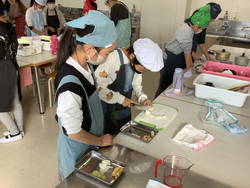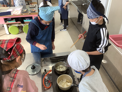 家庭科の「食べて元気に」の学習で、味噌汁の調理実習を行いました。出前授業で学習した「うまみ」のもと、だしを煮干しからとり、味噌汁をつくりました。材料に合わせた切り方で切ること、火の通りにくいものから煮ることを意識して、班で声をかけあいながら進めることができました。完成した味噌汁を「美味しい!」「だしがきいているね!」と話しながら、試食をしていました。
