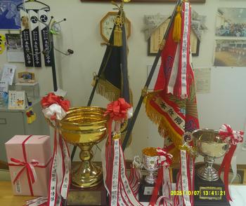 校長室には、明日予定されている全体練習のために、優勝旗や準優勝杯が準備されました。