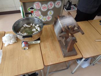 サンサン32(3年生)は、八聖殿の相澤館長を招いて、蚕の糸繰りを行いました。