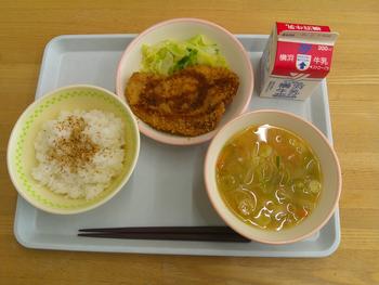 今日のとんかつは、調理員さんが1枚ずつ衣をつけて、油で揚げて作ってくれました。「また給食に出てほしいな。」「家でも作ってもらおう!」大満足の給食になりました。