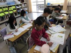 教科書の絵を見て、一人ひとりお話(のストーリー)を考えました。考えたお話を友だちと伝え合った後、「 」を使いながら書く練習をしました。