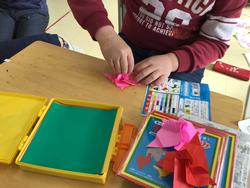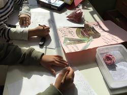 生活の学習ではまみらい折り・青梗菜でバラスタンプをつくりました。