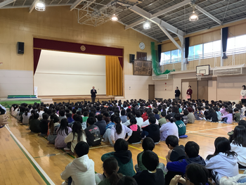 新しく入学した1年生を2~6年生の児童が温かく迎えました。初めて全学年が顔を合わせて集まることができました。これから始まる学習の内容や、決まりを学べる○×クイズを楽しんで聞いていました。