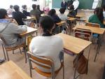 寛政中学校の生徒会の生徒が来校し、中学校生活についてガイダンスをしてくれました。児童から「水筒の中身は?」と質問すると、「学校に自動販売機もあります。」という答えで驚いていました。「頼りになる先生は誰ですか?」「部活動は新しく作れますか?」などたくさんの質問をして、4月からの生活を楽しみにしているようでした。