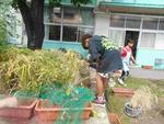 この日は、バケツ稲の置いてある花壇の雑草を抜き、バケツ稲の土を乾かすために、校舎内に運びました。ほとんどの稲が、黄金色になり、頭を垂らしています。この後、どうやって、「お米」に代わっていくのか、楽しみですね。