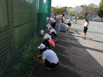 ネット沿いの草も協力して抜いています。