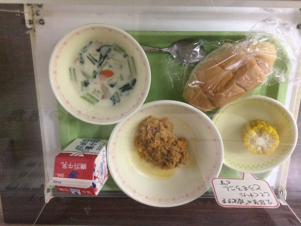 7月9日の献立です。ロールパン、イタリアンペースト、クリームスープ、ゆでとうもろこし、牛乳。