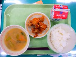いよいよ待ちに待った給食が始まりました。1年生は初めての給食です。給食の受け取り方や運び方などを一つ一つ確認しながら準備を進めていました。初日のメニューは、ごはん みそ汁 とり肉の竜田揚げ 牛乳です。みんな竜田揚げを楽しみにしていたようです。