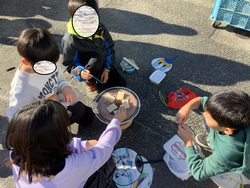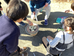 1月8日 七輪体験(3年)。社会科の学習で、昔の市民生活を学習します。その一環で、七輪を使って火起こし体験を行いました。なかなか炭に火が移らず、「(うちわで)扇いで、扇いで。」「消えちゃう。」と、悪戦苦闘しながら活動しました。活動後は、七輪でお餅を焼いて美味しく食べました。