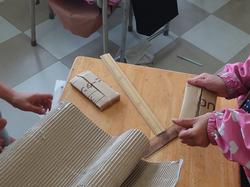 子どもたちは、もう使えなくなったクリアファイルを使って型を作り、給食室や印刷室からもらってきた段ボールを加工して、さっそくお財布作りを始めています。上手に作れるようになったら、ほかの人にプレゼントしたいという想いをもっています。