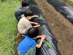 いつも野菜のことを教えてくださる木村先生とサツマイモの苗を植えました。「苗をねかせるようにして植えよう」というコツを聞き丁寧に植えました。みんな一人ひとり「大きなサツマイモができるように」と願いを込めて頑張りました。