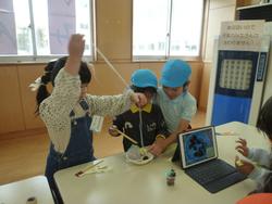 また、シャボン玉遊びでは、いろいろな材料でシャボン玉をつくっていましたが、うちわから大量のシャボン玉がでてくる様子には、大歓声が上がっていました。