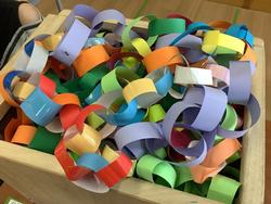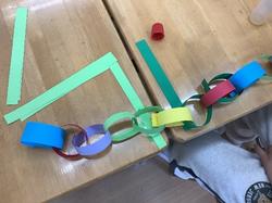 4月に入学した1年生と仲良くなるために、「1年生と仲良くなろう大作戦」としてパーティーの準備に取り組んでいます。今日は1年生が楽しめるレクリエーションを考えたり、どんなプレゼントを渡すか話し合ったりすることができました。授業の最後にはパーティーで飾る輪飾りを作りました。みんなで協力して、長い長い飾りを作ることができました。