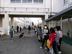校庭では、1年生が凧揚げをしていました。「見て見て!あがったよ!」と叫びながら走っています。