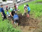 5年生の米作りが始まりました。学校近くの「星の子農園」に土を取りに行き、自分のバケツに土を入れます。学校に戻って水を入れ、「しろかき」タイム。手に体重をかけ、よく混ぜました。種もみを入れて完了。おいしいお米ができますように。