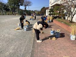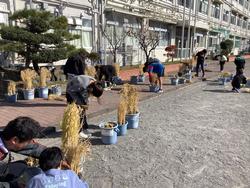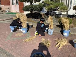 5年生が、黄金色に実ったバケツ稲をハサミで丁寧に刈り取り、収穫しました。食べ物の大切さや農家の方の苦労を学ぶ、貴重な体験になりました。刈り取った稲は束ねて、風通しのよい場所で干すそうです。