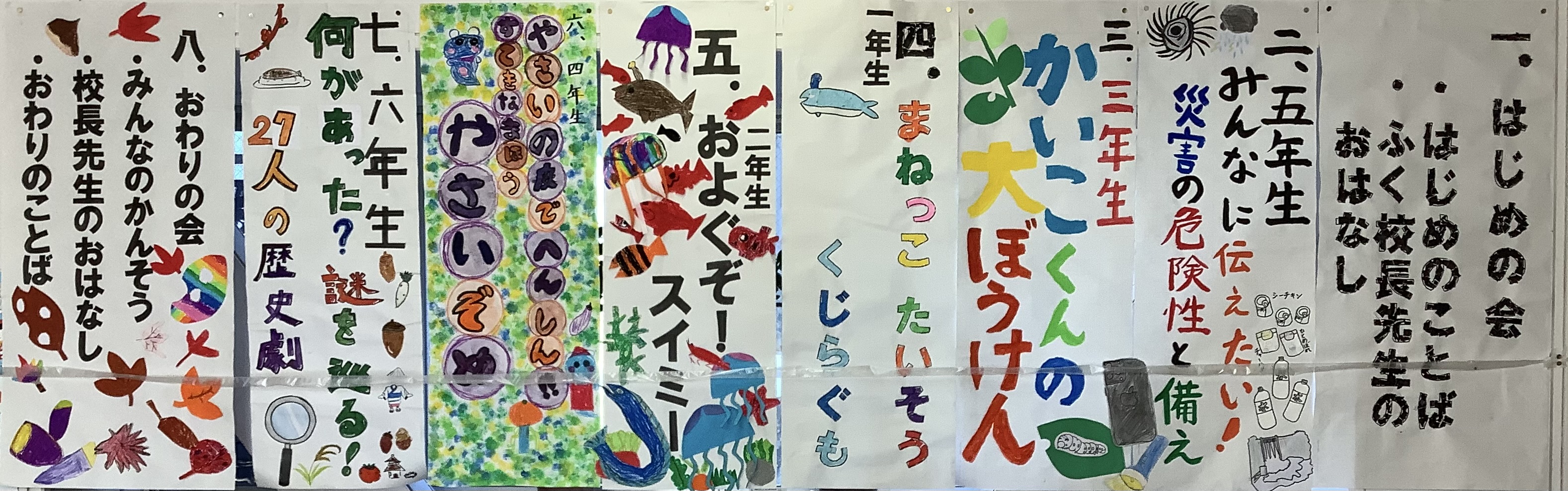 上小フェスティバルのプログラムが出そろいました。日頃の学習の成果をお伝えするために発表方法を考えて各学年ごとに準備を始めているところです。今年度もバラエティーに富んだ発表になりそうです。 若葉台小学校と上川井小学校の5年生が球技を通して交流する旭区小学校親善球技大会が若葉台小学校で行われました。今年度は昨年度に引き続いてタグラグビーの大会を行いました。この大会の特色は学校対抗ではなく、両校児童の混合チームを作り、混合チームで力を合わせてプレーすることです。チームメイト同士がとてもよく声をかけあっていて良い交流会になりました。若葉台小学校の皆さん、ありがとうございました。 11月に入り、上小フェスティバルが行われる月になりました。上小フェスティバルは子どもたちが日頃の努力や学びを発表する大切な場です。各学年、テーマをもって取り組んでいきます。プログラムを作成している様子です。心を一つに準備を進めてまいります。 今日は日中曇り空で気温が上がらず寒い一日でした。にもかかわらず、休み時間には寒さに負けず元気に外遊びをしている子どもたちがたくさんいました。11月も中旬にさしかかり、かぜ等が大流行する頃になりました。外遊びで体力作りをするとともに、手洗いとうがいをしっかり行い、予防に努めて欲しいです。 来週11月18日に上川井小学校と若葉台小学校の2校で球技交流会を行います。今年度の会場は若葉台小学校です。種目はタグラグビーです。本校の練習は5・6年生合同で行い、6年生が5年生に昨年度の経験を生かし教えています。6年生が5年生に声をかけながら、楽しく練習をしています。今日は開会式と閉会式のリハーサルも行いました。 今日の集会は、校庭で「宝探し」を行いました。 なかよし班ごとに協力しながら、校庭のさまざまな場所に隠された宝の紙を探し、ポイントを集めました。 どの班も笑顔いっぱいで、仲間との絆を深める貴重な時間となりました。 上川井幼稚園を訪問して幼保小交流をしました。自己紹介後、秋遊びをしたり、園庭で遊んだりして楽しみました。 中休みに体力アップマラソンがありました。今日は11月下旬の気候ということで肌寒い中でのマラソンとなりました。すじ雲がきれいな日でした。子どもたちが元気に走る姿が秋の空に映えます。 中休みに体力アップマラソンがありました。準備体操をした後にみんなで校庭を走りました。スポーツの秋にふさわしいコンディションでした。寒くなってくると屋内で過ごし運動量が減りがちになります。ぜひ、生活の中に運動を積極的に取り入れて元気に過ごしてほしいです。更新情報