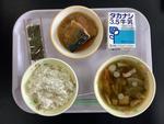 20日むぎごはん ぎゅうにゅう さばのあまずあんかけ ゆでやさい くきわかめスープ