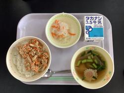 13日むぎごはん ぎゅうにゅう ツナそぼろ しらたまぞうに なます