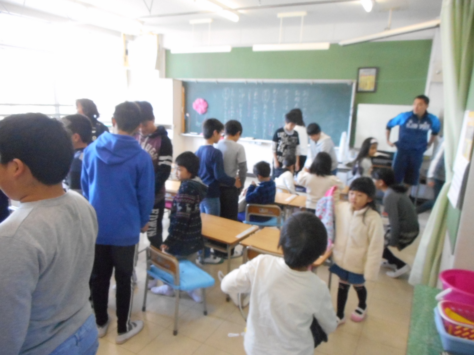 登校初日はあいにくの雨でしたが、早速6年生が1年生の準備の手伝いをしており、教室は笑顔であふれていました。