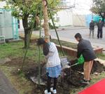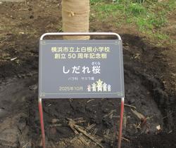 10/31(金)の朝、50周年を記念して記念樹(しだれ桜)を植えました。実行委員を中心に式を進め、他の子どもたちは教室でオンライン配信で参加しました。何年も先、このしだれ桜が、上白根小学校の子どもたちの成長をずっと見守り続けてくれることでしょう。来年の春には、花が咲く予定です。楽しみですね。職員室前に植えてありますので、学校に来校された際、ぜひご覧ください。