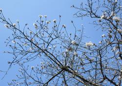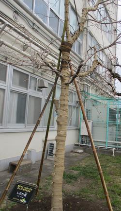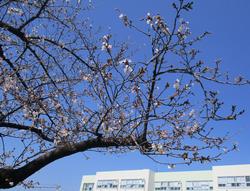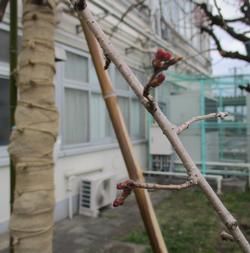 学校にある桜の木に花が咲き始めました。卒業や進級をお祝いしているかのようです。今年度、植樹した、しだれ桜の記念樹もつぼみをつけはじめました。