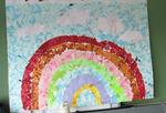 1年生の教室には、今の6年生が5年生の頃に作った掲示物が掲示してあります。「新1年生に教室で、安心してほしい。」「自分たちの顔を覚えてほしい。」という思いから、ちぎり絵の掲示物や6年生の顔写真の掲示物をつくりました。1年生は、興味をもって見ていました。