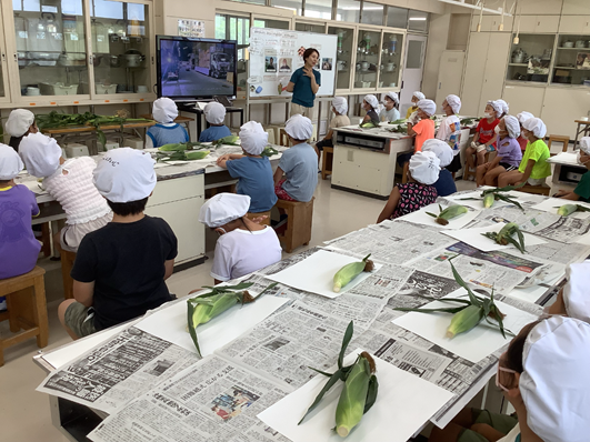 2年生が、給食に関わる人々がどのような思いで仕事に携わっているかを感じる食育のねらいから、全校の給食として出るトウモロコシの皮むきを体験しました。