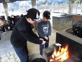 2日目は、上郷森の家で、火おこし体験をしました。友達と協力して作った焚き木に火をつけ、マシュマロを焼いて食べました。
