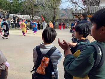 子どもたちがとても楽しみにしていた初日の日光江戸村の活動では、江戸の文化を楽しみながら、忍者になりきってみたり、地獄の世界を体験したりしました。江戸村のマスコットキャラクターである「にゃんまげ」が現れると子どもたちは撮影チャンスに大盛り上がりでした。