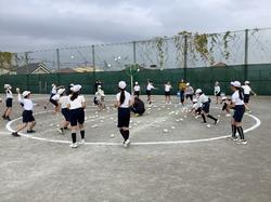 玉入れ・リレーから1種目を選択して、それぞれ合同チームで取り組み、最後は目標別で長縄を行いました。いつもより遠くからの玉入れは、見ている人も手に汗握って応援して大いに盛り上がり、トラックを大きく駆け巡るリレーは、バトンパスやカーブでの駆け引きに注目が集まりました。目標別での長縄は、一人ひとりそれぞれの目標を意識して、取り組むことができました。短い時間の中で、学校同士仲良く交流できました。