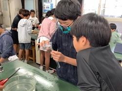 理科では、水溶液の学習をしています。5種類の水溶液を比べたときに、一つだけ見た目ですぐにわかる水溶液がありました。つぶつぶの小さな泡が出ている炭酸水です。今回は、その泡の正体を調べました。子どもたちの予想では、「二酸化炭素」や「酸素」、「ガス」などの意見が出ました。これまでの学習をもとに、石灰水や火を使えば確かめられると考えて実験をしました。炭酸水から集めた気体に石灰水を入れると、石灰水が白く濁ったこと、またその気体に線香の火を近づけると火が消えたことから、気体の正体は二酸化炭素であることに気づくことができました。