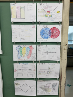 頭の中になんとなくある考えを「見える化」することで、自分の考えを整理したり、友だちと伝え合う際に、より分かりやすく伝えたりすることができます。そのために、シンキングツールを活用した学習をしました。シンキングツールの使い方を確認し、自分の考えを整理するためのシンキングツールを選んで整理する様子が見られました。どの学習でも、自分の考えを整理し、友だちと伝え合っていけるよう今後も支援していきます。