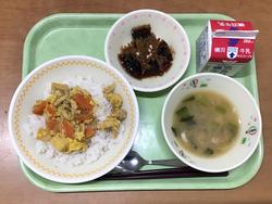 今日の給食の肉そぼろはお肉に味がついていておいしかったです。月見じるの白玉ももちもちでおいしかったです。あまずあえは酸っぱくて美味しかったです。(給食委員会) |