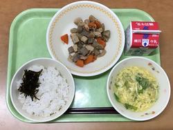 ★1月22日(木) 麦ごはん 牛乳 炒り鶏 かきたま汁 こんぶのつくだ煮