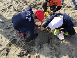 その後は砂浜で、土や砂の感触を味わいながら造形活動を楽しみました。