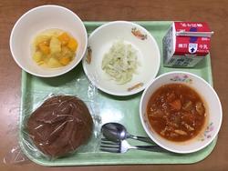 トマトシチューは、すごくとろとろしていて美味しかったです。キャベツサラダは、キャベツがシャキシャキしてておいしかったです。ミックスフルーツは、とても甘くておいしかったです。(給食委員会e.k ) |