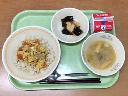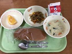 みそしるは、ずるずるしておいしかったです。おやこどんのぐは、肉、たまご、がとてもおいしかった。くろみつかんはきなこととてもあっていてあまくておいしかったです。(給食委員会T&K) |